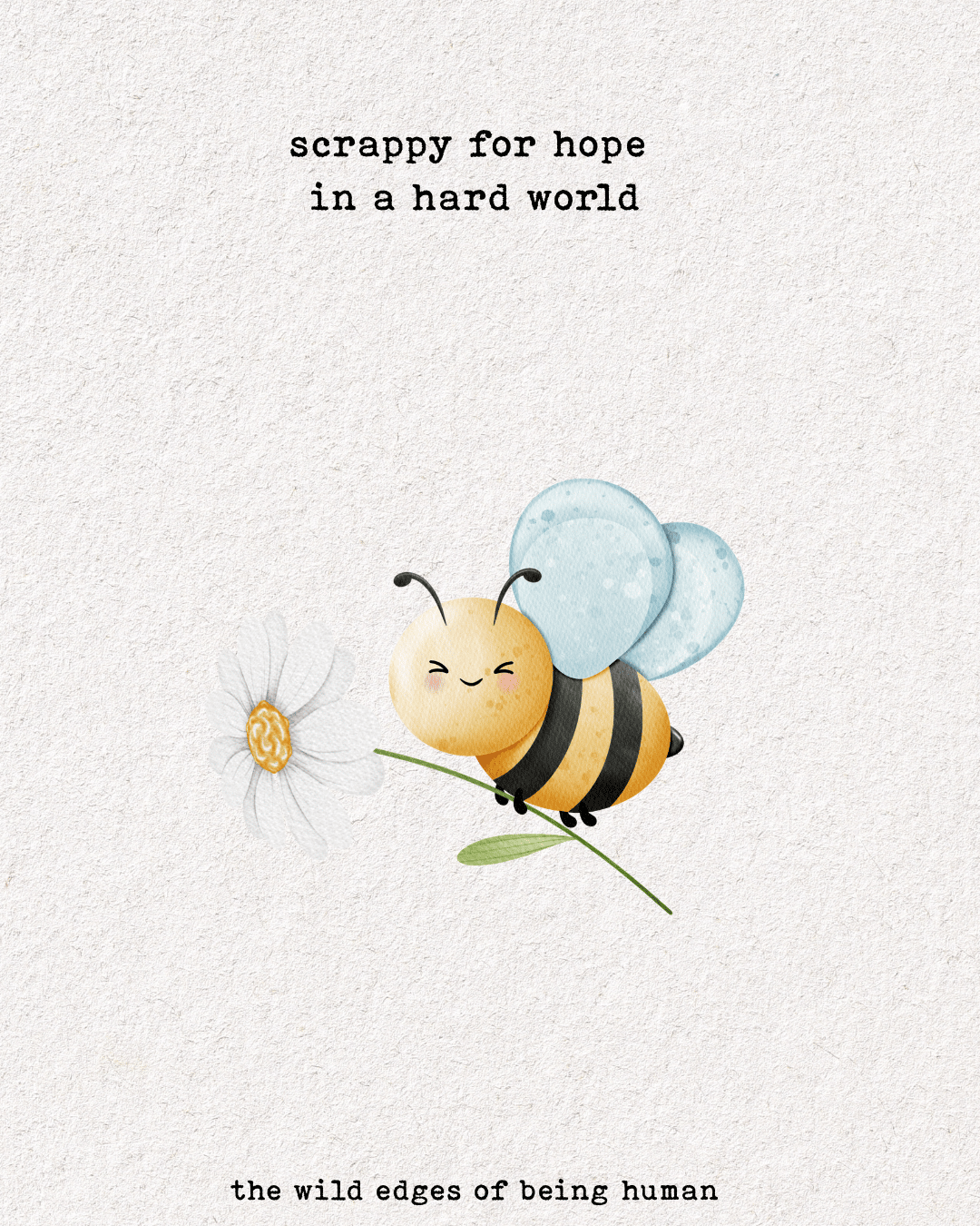 Scrappy for hope is a strategic refusal to let despair rot your insides. When it is tempting to give in, quit, or worse, this phrase reminds me of the tiniest things that can keep my feet on the ground. I wanted to offer them to you. With this cheesy ass bee image I made on Canva. Almost too happy for the zeitgeist, I know. But damn, if those backyard bees and my wild flowers aren’t a part of my Scrappy for Hope Strategy.